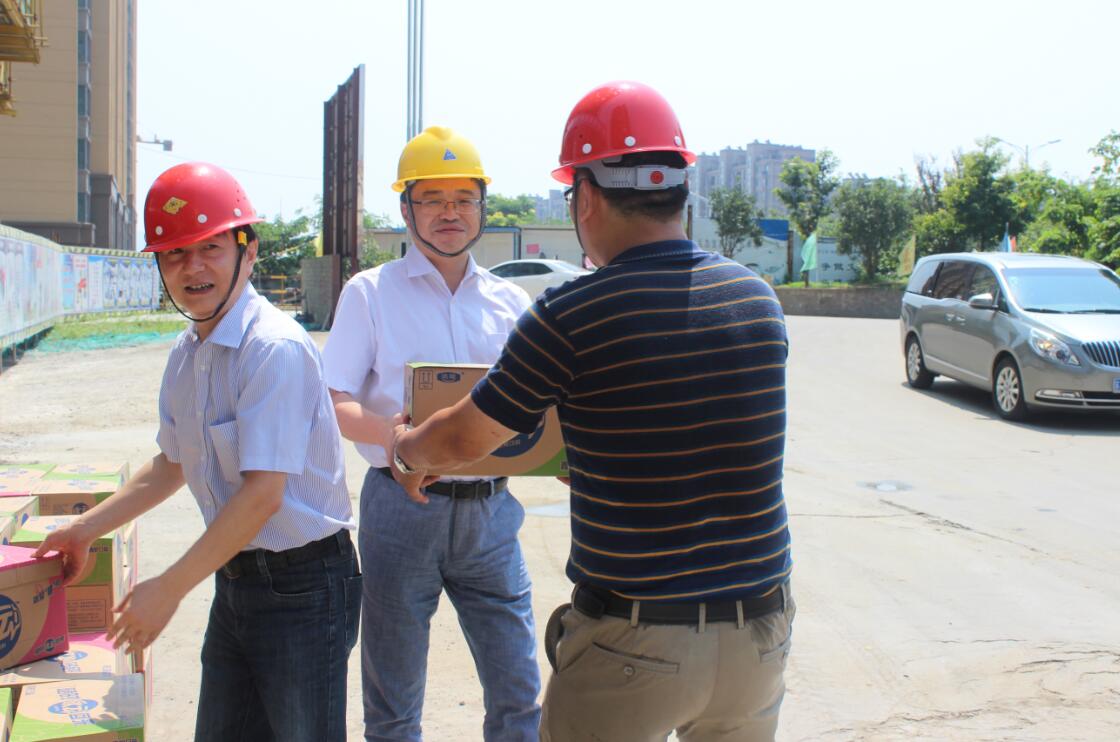 根據(jù)控股集團(tuán)上半年經(jīng)濟(jì)工作會議精神,按照建設(shè)集團(tuán)黨委的統(tǒng)一部署,7月29日上午,建設(shè)集團(tuán)董事長、黨委副書記周君,總經(jīng)理、黨委副書記孫新山,副總經(jīng)理張鋼平一行赴溧水愛濤置地公司,慰問奮戰(zhàn)在施工現(xiàn)場的一線職工,并發(fā)放防暑降溫飲品,為廣大職工“送清涼”。